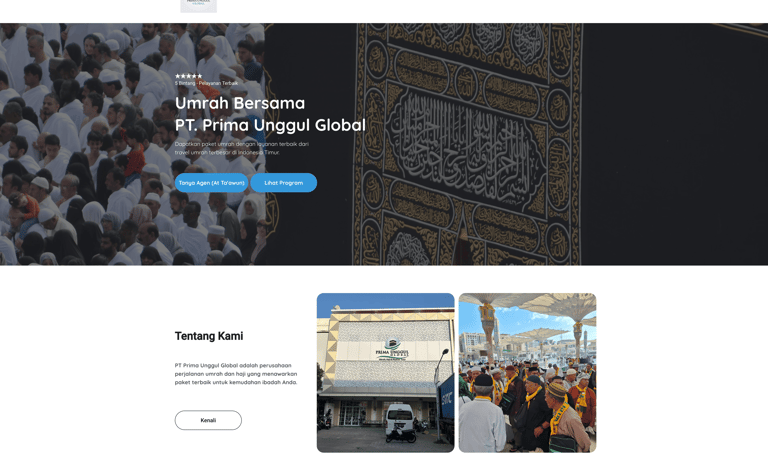 Website yang ringan ini dibuat dengan Hostinger Website Builder, terindeks dengan GSC, serta analisis datanya dihubungkan dengan Google Analytics. Selain informasi mengenai perusahaan, website ini juga dilengkapi dengan bagian Blog di mana pengunjung bisa menemukan artikel bermanfaat seputar layanan umrah.